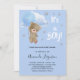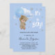 Para um chá de fraldas celebrando um menino. Um fundo azul com estrelas. Um ursinho de pelúcia segurando um balão azul claro. Personalize e adicione o nome da mãe a ser e os detalhes da festa. O nome e o texto: É um Rapaz! são escritos com um estilo escrito à mão