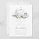 Apaixonem-se por este design botânico etéreo para chás de fraldas de outono. O Elegante design apresenta uma abóbora branca de aquarela flanqueada por flores brancas, folhagem verde e folhas de eucalipto. "Um pouco de abóbora está a caminho" aparece em letras de cinza, com os detalhes do seu chá de fraldas embaixo.
