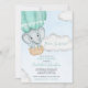Este convite de chá de fraldas cômico apresenta um adorável elefante bebê voando entre as nuvens de um balão de ar quente verde-menta em um fundo azul de aquarela. Fácil de personalizar com opções personalizadas clicando no botão "Personalizar".
