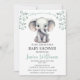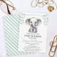 Cartão de convite para chás de fraldas com elefante verde-aquarela neutro em termos de gênero.
