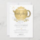 Modelo moderno, sofisticado, elegante e chic para chá de chá de fraldas, apresentando um pote de chá minimalista em camadas digitalmente douradas (não em folha real), jorrando corações douradas, assim como um delicado verde azul-bebê, desenhado à mão em lápis de grafite colorido. O título, "A Sweet Little Boy is Brewing", na caligrafia moderna e floresce delicado. Perfeito para uma festa de chá de chá de fraldas de menino elegante, elegante e moderno, um chá de fraldas preto, branco e ouro e para mães adorarem caligrafia e tipografia clássicas de roteiro de rico. Personalize cada linha de texto.