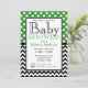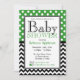 Convites de chá de bebê, giros e na moda, com bolinhas brancas sobre verde no topo e um padrão zigue-zag chevron preto e branco no fundo. Personalize com os detalhes do chá da Mamãe e escolha o tipo de papel também!