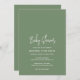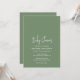 Convite moderno de chá de fraldas verde sábio com um simples design com o título do evento em uma tipografia de script elegante e seus detalhes de evento em uma fonte minimalista sans serif. Este convite chic é neutro em relação ao sexo, fazer perfeito se você está tendo um bebê ou uma menina.