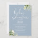 Um convite elegante e na moda com chá de fraldas, com tipografia elegante e bonito folhagem botânica num fundo azul empoeirado. Projetado por Thisnotme©