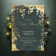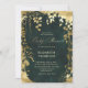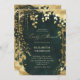 Um quadro branco de folhagem exuberante, cintilante com luzes de fadas e poeira mágica, em camadas com efeito dourado (isto é um efeito digital, não uma folha real ou um brilho!) decora este primavera de verão outono o convite para chás de fraldas neutros de inverno com um tema de floresta encantada e um fundo verde esmeralda. Um convite elegante e moderno para um chá de fraldas de conto de fadas. Perfeito para mães e pais que amam o cenário florestal de conto de fadas, o tema floresta de fadas ou jardim de fadas e o verde esmeralda, e que querem uma celebração neutra em termos de gênero.
