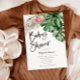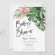 Cartão de convite para chás de fraldas moderno com ilustração aquosa de verde tropical incluindo monstera, palma, flor de proteína rosa-rei. Perfeito para um chá neutro no verão.