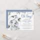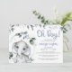 Convite moderno para chás de fraldas, com um elefante de aquarela giro segurando um coelho recheado rodeado de eucalipto macio, aquoso e verde em azul empoeirado e cinzas com o título OH BOY! na tipografia do roteiro de caligrafia. ASSISTÊNCIA: para obter ajuda com a modificação/personalização do design, alteração de cor, transferência do design para outro produto ou, se você quiser coordenar itens, entre em contato com o designer ANTES DE ENCOMENDAR através da guia MENSAGEM de bate-papo Zazzle ou por e-mail em makeitaboutyoustore@gmail.com.