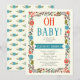 Oh Chá de fraldas vermelho e azul-lacre convite para a fronteira floral mostrando a frase "Oh baby" em vermelho e lacre, uma ilustração de uma fronteira floral feita de lindas flores selvagens com folhas verdes de azeitona em fundo de marfim. Texto em preto e branco em uma faixa de cor.