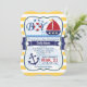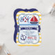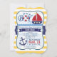 É um menino! Bonito, Náutico, Navegante, tema litoral de praia chá de fraldas de garoto convidado para o padrão retrorreflector de listras amarelas e brancas brilhantes. Possui veleiro marinho azul, vermelho e amarelo navegando na água do oceano ondulada, salva-vidas vermelhas e brancas e âncora azul do barco. As cores incluem marinho, vermelho, amarelo, branco e azul-céu. Convite em forma de colchete de safra.