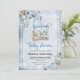 Um convite bonito para a colheita com uma ilustração de uma carruagem de bebê e de um urso bebê. Nos cantos há um buquê de flores azuis