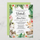 Celebre a chegada do seu bebê precioso com este elegante, chic e bonito Convite Virtual Chá de fraldas com animais bonitos amigáveis de safari da selva com máscaras em lindas flores tropicais de aquarela com fundo verde de folhas da selva. Todos os textos estão pré-organizados para que você personalize fácil e rapidamente com os detalhes do seu chá de fraldas.