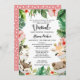Celebre a chegada do seu bebê precioso com este elegante, chic e bonito Convite Virtual Chá de fraldas com animais bonitos amigáveis de safari da selva com máscaras em lindas flores tropicais de aquarela com fundo verde de folhas da selva. Todos os textos estão pré-organizados para que você personalize fácil e rapidamente com os detalhes do seu chá de fraldas.