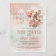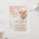 Um design de Chá de fraldas Virtual, bonito, com um ursinho de pelúcia com uma gravata de arco rosa em uma cesta amarrada a um monte de balões de terras rosa e leves adornados com flores cor-de-rosa. As palavras "Podemos Andar Esperando!" flutuam nas nuvens. Um fundo de aquarela cor-de-rosa-rosa e branco-claro com esmaecimento branco ao redor do design. A parte traseira apresenta uma repetição do mesmo plano de fundo com bolinhas cor-de-rosa de dois tons. Design composto por Designs Holiday Hearts.