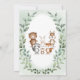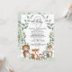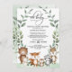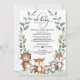 Celebre a chegada do seu querido bebê/garota com este convite de chá de fraldas mimático e neutro em relação a gênero. A design apresenta uma bela camada de água pintada manualmente e uma camada verde de cor aquática e um grupo de adoráveis animais florestais.