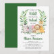 Um convite virtual de chá de fraldas, bonito e neutro, com um quadro de folhas tropicais de samambaias com bebês (leão, elefante, zebra, macaco e girafa) no fundo e "Está prestes a ficar selvagem", "Chá de fraldas virtual" e o nome da mãe em uma engraçada escrita rosa e tipografia manuscrita. Você também pode especificar se é um chá de bebê ou de menina.