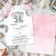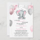 Este adorável convite para chás de fraldas apresenta elefante de menina rosa e cinza com balões e confete. A parte traseira apresenta uma aquarela rosa macia. Facilmente personalizado para seu evento clicando em personalizar.