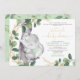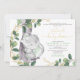 BABY! Um doce amendoim está a caminho! Imprima seus hóspedes com este belo convite "chá de fraldas por correio" neutro de gênero, com a ilustração aquática de um adorável elefante bebê cercado por verde-luxuoso em verde e ouro. Use os campos modelo para adicionar seus detalhes. Se quiser alterar o estilo da fonte, a cor ou o posicionamento do texto, basta clicar no botão "Personalizar Mais".
