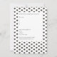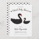Um convite virtual para chás de fraldas com um tema de cisne negro em um fundo de ziguezague branco. O convite inclui um padrão de pequenos corações nas costas. A parte traseira também inclui espaço para instruções para ingressar na parte virtual e onde cartões e presentes podem ser enviados.