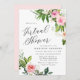 Chá de fraldas virtual elegante, floral, com buquês de flores cor-de-água rosa e pinceladas com folhas verdes vívidas. A frase "Chá virtual" é exibida em um script de caligrafia moderno com os detalhes de seu chá apresentados abaixo. O convite se reverte para um fundo cor-de-rosa pincelado.