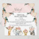 Os animais safari de menina doce e elegante são chá de fraldas convite com um boho e influência marroquina. Este design apresenta quatro animais da selva, alguns arranjos cor-de-rosa de erva floral e pampas e alguma folhagem. Esta é uma forma moderna e doce de convidar convidados para o chá de fraldas virtual safari de uma menina.