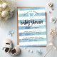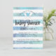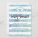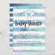 Banda branca e azul, fundo para celebrar um chá de fraldas temático para um bebê. Um coelho branco aparece logo acima do texto "Chá de fraldas". Editar áreas de texto para criar uma parte de chá de fraldas exclusiva e especial.