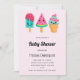 Convite para chá de fraldas com uma ilustração de 3 tratamentos de sorvete diferentes. Um picolé azul-esverdeado com gotas de morango e salpicadores coloridos. Um picolé de melancia. Um cone com camadas deliciosas de sorvete em rosa e menta. Todos com sorrisos kawaii fofos.