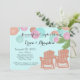 Lanternas de papel cor-de-rosa, laranja e aqua sobre cadeiras de adirondack, convite para chás de casal de tema de praia.