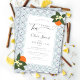 Um convite de chá para festas de chá de noiva que inclui laranjas e flores e folhas de laranja, desenhadas à mão em aquarela digital e um padrão de azulejos inspirado nas tradições mediterrânicas. Personalize-o com o nome, a data, a hora e todos os detalhes. Caligrafia moderna pelo nome da noiva.