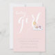 Menina adormecida chá elegante tipografia cor-de-rosa pincelada elegante convite apresentando o texto menina branca sobre fundo rosa pincelado e uma menina de roupas cor-de-rosa com um pouco de azul dormindo em uma nuvem e a lua crescente amarela. Texto na cinza. A parte de trás está coberta por um padrão de bebê. Você pode mudar a cor de fundo. Alguns elementos de Trina Clark.