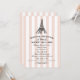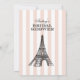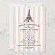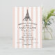 Um convite de chá de noiva com tema Paris romântico e aconchegante com uma Torre Eiffel ilustrada em listras rosa champagne e branco. A caligrafia e os floreios decorativos em preto adicionam charme de café francês à paleta neutra e suave. Também fica lindo para um almoço de noiva. Cada detalhe é totalmente personalizável.