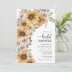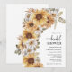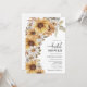 Convite de Chá de Noiva de Girassóis. Adicione um toque de sol ao seu chá de noiva com esses belos girassóis amarelos pintados à mão em aquarela, margaridas brancas e folhas de cor verde-sage e terracota. Perfeito para um outono rústico romântico ou uma festa de jardim de verão ao ar livre, esses convites de chá de noiva boho chic deslumbrantes vão definir o tom do seu dia especial. Encontre produtos coordenados nos Convites de Casamento de Girassóis em Aquarela Rústica.