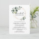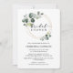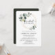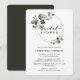 Convite de chá de noiva elegante com círculos dourados de eucalipto em aquarela emoldurando "chá de noiva" em tipografia clássica e script, simples, chique e lindo que seus convidados vão adorar receber. No verso do convite há um verde pinho sólido.