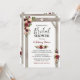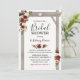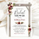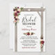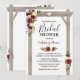 Convites de chá de noiva de casamento outonal apresentando um fundo branco elegante e sofisticado que pode ser alterado para qualquer cor, uma exibição floral em aquarela elegante em burgundy, vermelho marsala e rosa bege em uma pérgola de casamento de madeira rústica, um coração esculpido com as iniciais do casal e um modelo de convite de festa de noiva moderno.