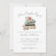 Um Novo Capítulo Começa. Celebre a chegada iminente do seu pequeno com este convite de chá de bebê simples e doce inspirado num tema de estilo de livro de histórias. No topo, a frase “Um Novo Capítulo Começa” aparece numa escrita suave à mão, estabelecendo um tom caloroso e significativo. Abaixo, uma pilha de aquarela de três livros em tons bege, cinza e verde é acentuada com delicadas flores silvestres e folhagens em rosa suave, amarelo, azul e roxo para uma aparência suave e alegre.