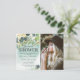 Convites elegantes de chá de noiva com foto, apresentando uma lavagem de aquarela verde empoeirada/azul, folhas botânicas verdes elegantes, respingos de folha de ouro falso, uma foto da noiva e um modelo de festa de chá de noiva simples e fácil de personalizar.