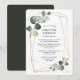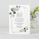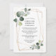 Elegante convite de chá de noiva com moldura geométrica dourada e eucalipto em aquarela, folhagens botânicas e pitadas de dourado que tornam este convite simples, chique e lindo que seus convidados vão adorar receber. No verso do convite há um verde pinho sólido.