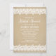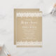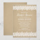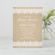 Um convite encantador para chá de noiva com tema rústico, apresentando um fundo de papel kraft texturizado emoldurado por bordas de renda branca ornamentada ao longo da parte superior e inferior com delicados acentos de bolinhas. A caligrafia branca e a tipografia serifada em negrito criam uma estética quente e artesanal perfeita para uma celebração no campo, celeiro ou casa de fazenda. Também é uma escolha encantadora para um almoço de noiva. Todo o texto é totalmente editável.