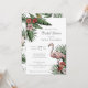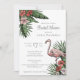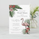 Este convite de chá de noiva elegante apresenta ilustrações temáticas de flamingos tropicais desenhadas à mão em tinta preta, mostrando flamingos rosa, flores de hibisco e jasmim e folhas de banana . O verso apresenta um belo padrão com esses elementos mais abacaxis e uma bebida tropical.