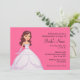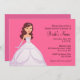 Convite de chá de noiva ilustrado em fundo rosa. Personalize este convite casual de noiva. Outras etnias e cores de cabelo estão disponíveis