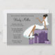Convide os convidados para um chá de panela de estilo com este Chá de panela moderno e elegante. Tem uma noiva sentada sobre uma pilha de presentes. Este design preto, branco e roxo é uma maneira elegante de convidar convidados para o seu chá. Alguns elementos © 2010 Jessica Weible/JD Digi Designs