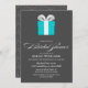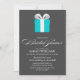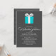 convites de chá de panela elegantes e chicos apresentam uma bela ilustração vetorial de uma caixa-presente azul com um arco branco sobre um fundo de cinza escuro.