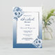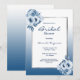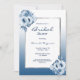 Na frente: um clássico fundo ombre azul e branco gradiente com um falso quadro prateado. Decorados com flores aquáticas, florais em tons de azul. Modelos para o nome da noiva e detalhes da festa. O nome e o texto: Bridal são escritos com um script de estilo manuscrito, letras azuis coloridas. Verso: gradiente azul clássico.