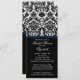Comece o seu evento com o nosso Chá de panela moderno e elegante de damask colocado sobre um fundo preto com uma banda azul de meia-noite. Apenas personalize nosso convite com suas informações de casamento e você está pronto para ir. Disponível em outras combinações de cores em nosso compro em www.celebrateitweddings.com. Veja nossas notas de agradecimento, adesivos e botões de noiva em nosso compro