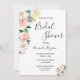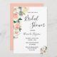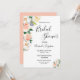 Um chá de panela floral em branco, coral e pêssego. Um fundo branco chic na frente. Decorados com flores grandes e peludas, florais em branco, coral e pêssego. Escrita moderna e extensa, tipografia com texto: Chá de panela. Modelos para o nome da noiva e detalhes da festa. Texto das cinzas escuras. Fundo: fundo colorido de coral.