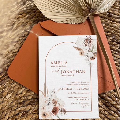 Chá de panela boho com grama-pampas, terracota e flores beges. coleção MYLA