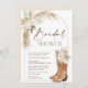 Chá de panela das Raízes Florais do Arch Modern Boho Beige Bridals um convite para o chá com botas de vaquinha, adoráveis arranjos florais beges, rumo à caligrafia moderna e forma arqueada. ideal para alguém que procura um convite para noivas de cor neutra.