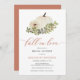 Este chá de panela de outono apresenta um arranjo botânico de água-colorida verde e abóboras brancas. As palavras "apaixonar-se" aparecem em um elegante roteiro de escrita manual em ferrugem com baloiços no início e no fim. Personalize o resto do texto com o nome da noiva a ser (também em ferrugem), o local do chá e outros detalhes na fonte sans serif. O reverso é uma sombra de ferrugem sólida correspondente.