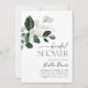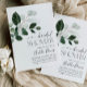 Um moderno chá de panela verde de eucalipto. Os bonito gráficos de folha botânica com letra moderna de escrita fazem deste o convite moderno perfeito para o seu chá de panela ou chá de cozinha.