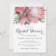 Belamente elegante e feminina, este adorável design de Chá de panela botânico apresenta um arranjo floral de cor d'água de flores e botões exóticos do Rei Protea. As cores incluem cor rosa claro e escuro, burgundy, lacre e cinza prateada. O buquê é colocado de forma destacada no topo do fazer do convite, uma bela declaração de impacto sobre o seu texto personalizado. Personalize o texto com os detalhes do evento. Como todo o texto pode ser personalizado, você pode mudar o título de Chá de panela para Bridal Brunch ou Bridal Luncheon ou outro título de evento para se adequar à sua ocasião.