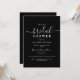Este elegante chá de panela preto-e-branco combina um design eterno com a sofisticação moderna. Apresentando caligrafia refinada e um layout minimalista, esse convite é ideal para honrar uma noiva especial com um tema de casamento chic e de alternativo. O fundo preto limpo contrasta lindamente com a escrita branca, oferecendo um toque clássico, inspirado no gótico, enquanto a simples, mas elegante borda adiciona uma camada de sofisticação e formalidade. Perfeito para noivas que apreciam uma combinação de estilos modernos e tradicionais, este convite oferece campos personalizáveis para o nome da noiva, detalhes de eventos e informações de RSVP. Seu contraste impressionante e design minimalista o tornam ideal para um chá de panela sofisticado e moderno. Independentemente de seu evento abarcar temas de elegância ou alternativo, este convite dará o tom para uma celebração inesquecível.